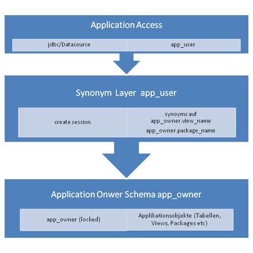 Somit hat der Applikationsuser keinen direkten Zugriff auf die Objekte und kann diese nicht verändern. Über das Viewkonzept wir ein zusätzlicher Apstraktionslayer eingefügt, so das Änderungen in Schema über die Views gekapselt sind. Damit können Datenbank- und Applikationsänderungen unabhängig voneinander ausgeführt werden.